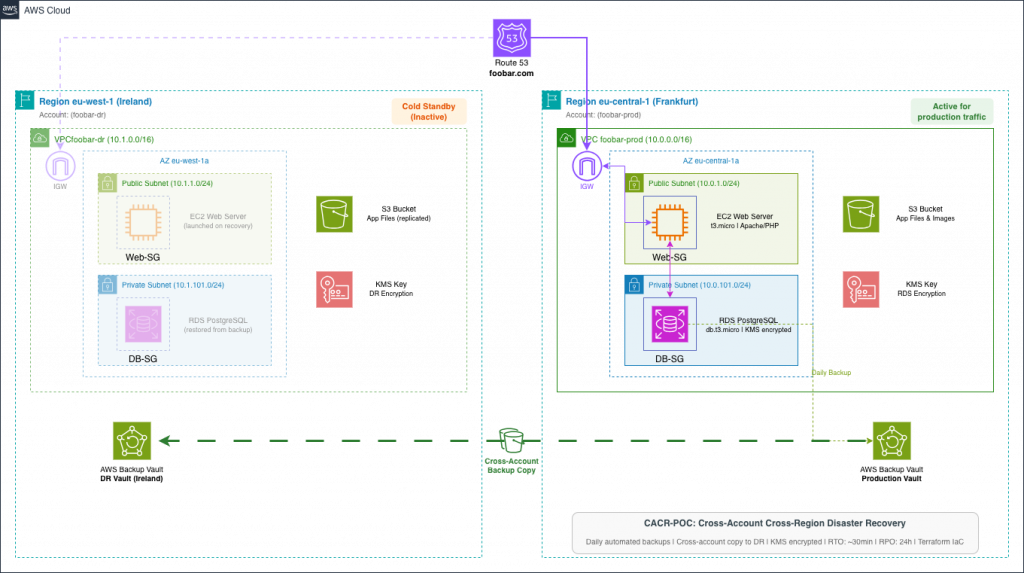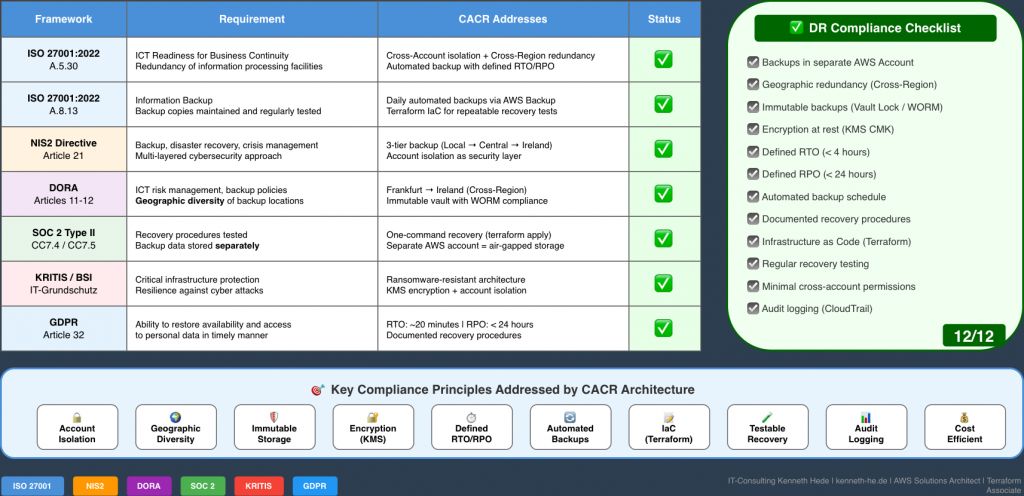Tags: AWS Disaster Recovery, DORA Compliance, NIS2, ISO 27001, Cross-Account Backup, Ransomware Protection, Infrastructure as Code, Terraform, Business Continuity, Cloud Architecture