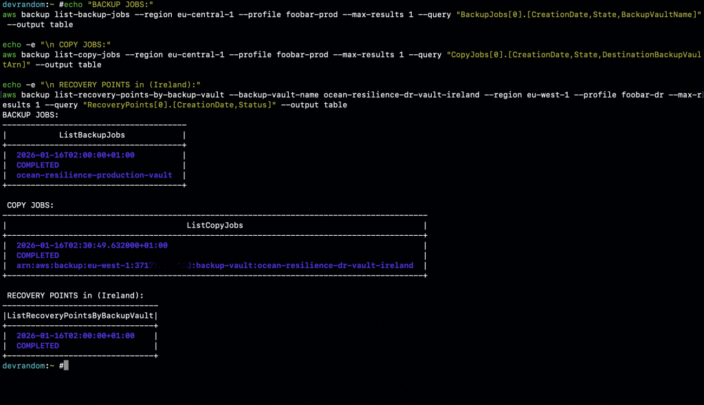 Caption: Recovery Points Successfully Replicated to DR Account (Ireland)
